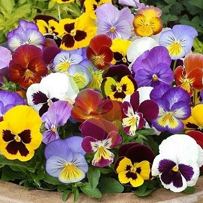 Анютины глазки Смесь сортов. Анютины глазки нередко называют виолой, но имеют также и научное название – фиалка. Является сильноветвистым растением с компактными или полураскидистыми кустиками, высота у которых составляет от 14 до 40 см. Цветки одиночные, крупные (диаметр до 7 см), образовываются в пазухах листьев, с разнообразной окраской: белые, желтые, оранжевые, синие, голубые, красные. Цветы однотонные или же имеются различные штрихи и пятна. Цвести начинает ранней весной и продолжается вплоть до осени. У современных гибридов есть способность к цветению до заморозков.