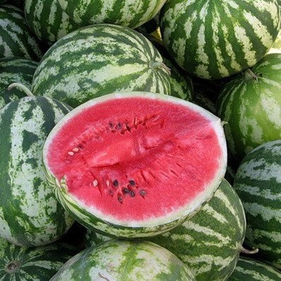 • Кожура у арбуза гладкая, с характерным рисунком из чередующихся темно и светло-зеленых полос с неровными краями.