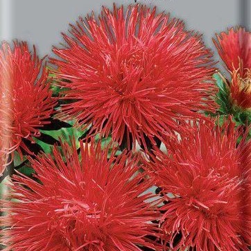 Астра Гигантские лучи Красная. Астра сортотипа Игольчатые. Красивое растение с крупными, до 12 см в диаметре, соцветиями. Куст широкий, ветвистый, высотой 70-80 см. Соцветия крупные, махровые, очень изящные, собраны из скрученных в трубочки ярких цветков. Одно растение даёт до 14 стеблей для срезки. Используется на срезку.