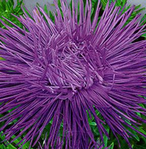 Астра Гигантские лучи Синяя. Астра сортотипа Игольчатые. Красивое растение с крупными, до 12 см в диаметре, соцветиями. Куст широкий, ветвистый, высотой 70-80 см. Соцветия крупные, махровые, очень изящные, собраны из скрученных в трубочки ярких цветков. Одно растение даёт до 14 стеблей для срезки. Используется на срезку.