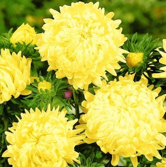 Астра пионовидная Дюшес желтая. Куст высотой 70 см. Соцветия желтые, 8-10 см в диаметре. Цветет август-сентябрь. Используют для посадки в сборные цветники группами, на рабатки – рядами и для срезки.