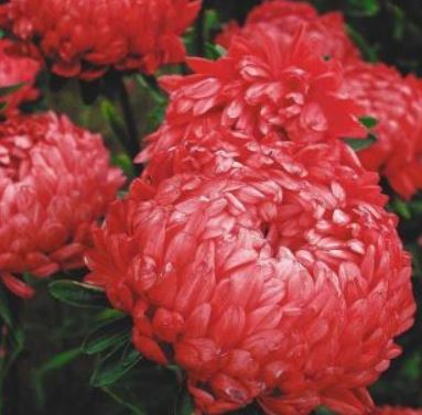 Астра пионовидная Дюшес красная. Куст колонновидной формы, ветвистый, высотой 70 см. Цветоносы прочные, густооблиственные. Соцветия ярко-красные, полусферические, густомахровые, непоникающие, 8-10 см в диаметре. Язычковые цветки широкие, приподняты вверх, закрывают трубчатые цветки. Цветет август-сентябрь. Используют для посадки в сборные цветники группами, на рабатки – рядами и для срезки.