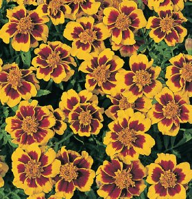 Бархатцы отклоненные немахровые Шаловливая Мариэтта. Куст компактный, густоветвистый, высотой 30-40 см. Соцветия плоские, немахровые, диаметром 5 см. Окраска язычковых цветков двуцветная: золотисто-желтая с большим коричнево-красным пятном у основания. Цветет с июля по октябрь. Используют для клумб, рабаток, бордюров и украшения балконов.