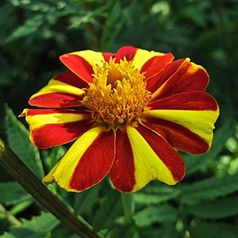 Бархатцы отклоненные немахровые Джолли Джестер. Куст высотой до 65 см, сильноветвистый от основания, боковые побеги отклоненные. Соцветия немахровые, диаметром 6 см. Окраска цветков оригинальная – красная с желто-оранжевыми полосами. Бархатцы великолепно смотрятся в цветниках, группами на газонах, на рабатках и в контейнерной культуре.