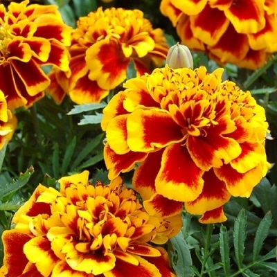 Бархатцы отклоненные махровые Двухцветный гигант. Кустики шаровидные, густоветвистые, высотой 30 см. Соцветия крупные, диаметром 5-6 см, махровые. Темно-красные язычковые и трубчатые лепестки с желтой каймой. Цветёт с июня до октября. Используют для клумб, рабаток, бордюров.