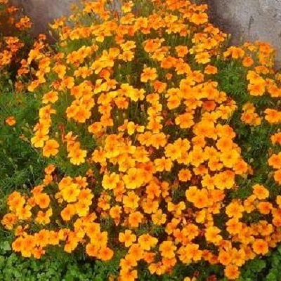 Бархатцы тонколистные Оранжевый самоцвет. Изящный шаровидный куст, высотой 20-30 см, очень ветвистый, с тонкими стеблями и светлыми перисто-рассеченными листьями. Соцветия плоские, немахровые, диаметром 2 см, оранжевые. Цветёт с июня по сентябрь. Используют для обрамления клумб, бордюров и украшения балконов.