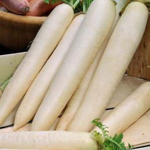 • Корнеплод длинный, сосульковидный с белой кожурой, головка плоская, мякоть полупрозрачно-белая.