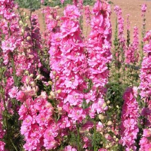 Дельфиниум крпупноцветковый  Розовая бабочка. Растение изящной компактной формы высотой около 40 см, с сильно ветвящимися побегами. Листья на длинных черешках, пальчато-рассеченные, сверху зеленые, снизу беловатые. Цветки открытые, светло-розовые, до 3,5 см в диаметре, собраны в редкую кисть на конце стебля. Цветет июль-август. Используют для создания смешанных групп, рабаток, в миксбордерах и на срезку.