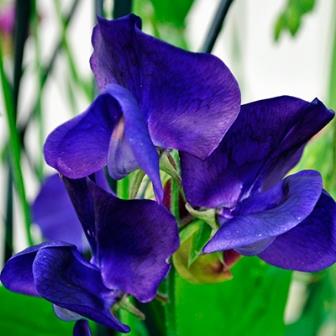 Душистый горошек Спенсер темно-синий. Лазающие крепкие, хорошо облиственные стебли до 250 см длиной. Цветоносы прочные, упругие, 25-45 см длиной. Цветки тёмно-синие, крупные, по 5-6 в кисти, с нежным приятным ароматом. Парус цветка с волнистым краем. Цветет с конца июня до заморозков. Используется для вертикального озеленения и на срезку.