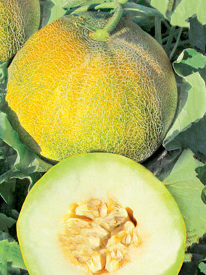 • Плод округлый, жёлтый с сероватым оттенком, гладкий, сетка средней толщины и средней плотности, линейной и сетчатой структуры.