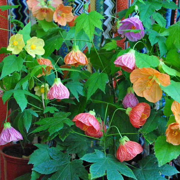 Абутилон гибридный Белла (Abutilon hybridum Bella). Компактный сорт для наружных контейнеров; также можно выращивать как комнатное растение.