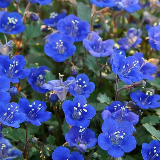 Фацелия колокольчатая Голубая - декоративное медоносное растение, высотой 20-25 см. Стебли прямостоячие, красноватые. Трубчато-колокольчатые цветки собраны в кистевидные соцветия. Голубые колокольчики с желтыми тычинками ярко выделяются на фоне сизо-зеленых лепестков. Цветёт обильно с середины июня по июль. Рекомендуется для рабаток, бордюров.