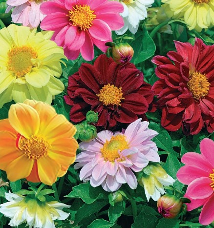 Георгина Анвинс смесь.  Клубненосное травянистое растение с компактной формой куста, высотой 50 см. Соцветия полумахровые, различных окрасок, диаметром около 10 см. Прекрасное растение для посадки в уличные вазоны и контейнеры, в садовые клумбы и миксбордеры.