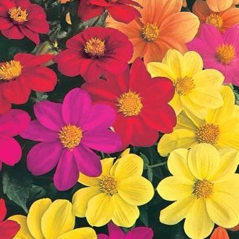 Георгина Пикколо Мигнон микс. Растения компактные высотой около 35 см. Соцветия диаметром 8-9 см самых разнообразных окрасок. Цветет с июля по октябрь. Используют в цветниках большими группами на клумбах.