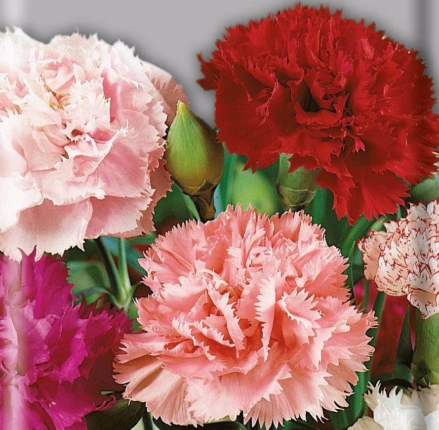 Гвоздика садовая Шабо Смесь окрасок. Цветки крупные, диаметром 4-6 см, махровые, душистые. Кустики обратнопирамидальные, компактные с чётко выраженным главным стеблем, высотой 60 см. Листья с серым или голубым налётом. Края лепестков зазубренные. Цветёт с июля по октябрь. Используют в цветниках и для срезки.