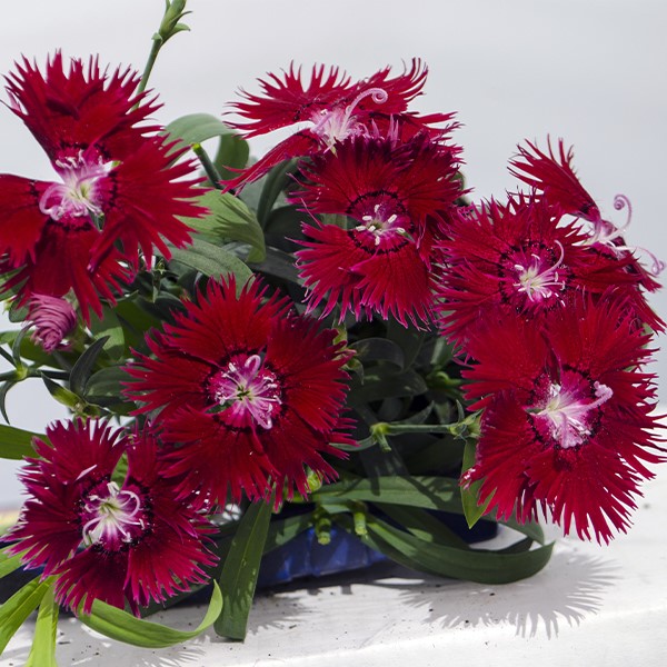 Гвоздика Супра (Dianthus interspecific Supra). Компактная межвидовая гибридная гвоздика с хорошим боковым ветвлением и крупными ажурными игольчатыми цветками до 4 см в диаметре.