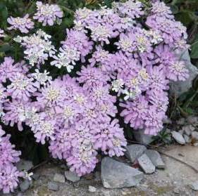 Иберис Гибралтарика. Полукустарниковое растение до 40 см высотой. Листья вечнозеленые, продолговатые, темно-зеленые, блестящие, до 7 см длиной. Цветки лиловые с белым центром, собраны в зонтиковидные соцветия до 5 см в диаметре. Цветет обильно в июне, иногда повторно в конце лета. Во время цветения соцветия почти полностью закрывают листья. После цветения нужно подрезать на треть длины, чтобы растения сохранили компактность. Используют для рабаток, бордюров, на газонах.