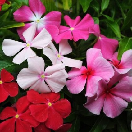 Катарантус розовый Смесь окрасок. Обильно цветущие кустики высотой 25-30 см. Листья овальные с белой срединной полосой. Цветки белые, розовые или красные. Любит обилие света, хороший полив и регулярные подкормки.