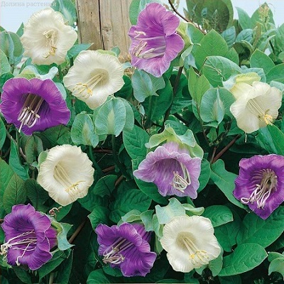 Кобея лазающая Смесь окрасок. Цепляется за опору усиками, образует многочисленные побеги до 3м. Листья перистые. Цветы фиолетовые, колокольчатые, диаметром 6-8 см. Цветет с июля до заморозков.