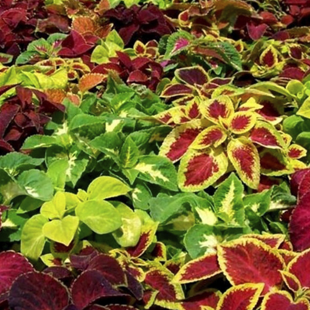 Колеус Блюме Смесь окрасок. Многолетнее растение, используемое как однолетнее. Куст высотой всего 50 см. Удлинённые листья длиной 5-7 см, сердцевидной формы, зеленовато-жёлтые, бронзовые и комбинации с красными оттенками. Края слегка зазубренные. Колосовидное соцветие из мелких синих цветков декоративностью не отличается и его, как правило, обрезают.