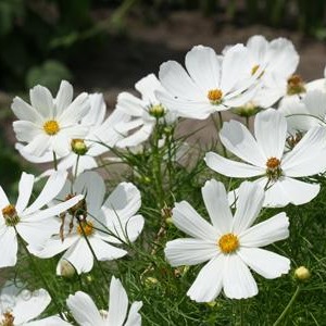Космея Сенсация Белая. Растение высотой 90-120 см. Цветки собраны в соцветия-корзинки, диаметром 7-10 см и расположены одиночно на концах стеблей. Язычковые цветки белые. Трубчатые в центре соцветия - желтые. Применяют для посадки на заднем плане цветников, декорирования оград и для срезки.