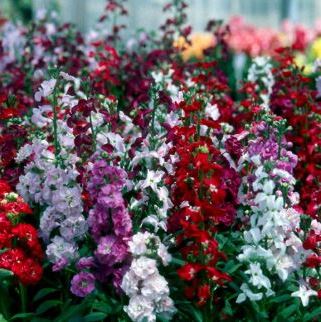Левкой седой (Маттиола седая) Гигант смесь окрасок. Растение высотой около 60 см, красивой пирамидальной формы. Крупные розовые, белые, красные, лавандовые цветы собраны в мощные вертикальные соцветия. Цветет в июне-августе. Используют очень широко: для посадки в сборные цветники группами, на рабатки - рядами, для бордюров и срезки.