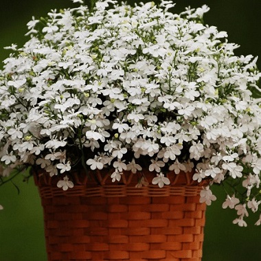 Лобелия плетистая Белый фонтан. Многолетнее растение, используемое как однолетнее. Красивое травянистое растение со свисающими побегами (длиной до 30 см), усыпано ,белыми цветками. Листья зеленые. Цветет с июня по сентябрь.