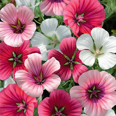 Малопа Смесь окрасок Побеги прямостоячие высотой около 90 см. Листья округлые на длинных черешках. Цветки крупные, диаметром 8-10 см, воронковидной формы, одиночные, венчик состоит из 5 лепестков. Окраска цветков пурпурная, розовая, белая. Цветёт обильно с июля до заморозков. Используют для групп на фоне газона, миксбордеров, декорирования стен и заборов.