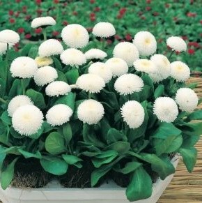 Маргаритка Белый шар. Высота растения 15 см.Соцветия язычкового типа, средние, 3-4 см в диаметре, полу- и полностью махровые. Язычковые цветки белые. Универсальное использование: как почвопокровное растение, для обрамления клумб, балконных ящиков, альпинариев.