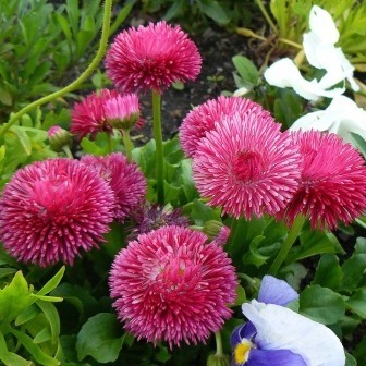 Маргаритка Мария. Высота растения 15-20 см. Махровые соцветия язычкового типа, 4-5 см в диаметре. Язычковые цветки розовые, расположены в 4-5 рядов. Цветёт в апреле-июне. Универсальное использование: как почвопокровное растение, для обрамления клумб, балконных ящиков, альпинариев.
