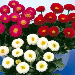 Маргаритка Галакси (Bellis perennis annua Galaxy). Низкорослые (высота -15 см), одинаковые и компактные растения, полумахровый цветок с желтым центром диаметром 3 см.