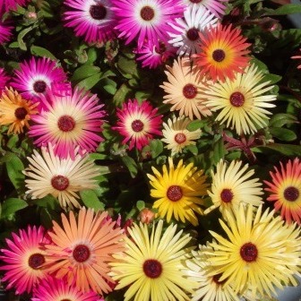 Мезембриантемум Искорки. Стелющееся растение с толстыми мясистыми желто-белыми листьями и стеблями. Отличается сильным ростом, образует ползучие побеги. Крупные цветки, диаметром 4-5 см. В пасмурные дни цветки закрываются, но при солнечной погоде вспыхивают ярким, сверкающим ковром. Используют для рокариев, бордюров, каменистых горок и как горшечная культура. Цветет всё лето, с июня до октября.