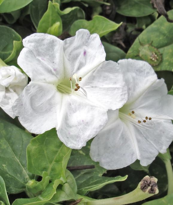 Мирабилис Белый леденец. Ароматные цветки белой окраски диаметром 5-6 см, раскрываются после 15 часов, а закрываются утром. Многолетнее растение, используется как однолетнее. Кустики 60-80 см высотой. Стебли прямостоячие, ветвистые. Цветёт обильно с июня до заморозков. Используют для оформления цветников, рабаток.