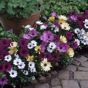 Остеоспермум Смесь окрасок. Растения компактные высотой около 25 см. Соцветия корзинки самых разнообразных окрасок. Цветет очень обильно с середины июля до сентября. Используют группами в миксбордерах и клумбах, прекрасное контейнерное растение.