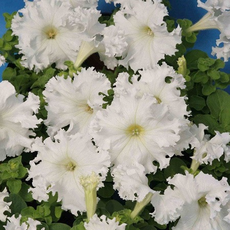 • Крупные цветки белой окраски с волнистыми и бахромчатыми краями диаметром 8 см.