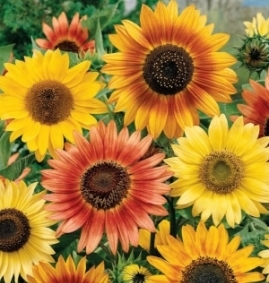 Подсолнечник однолетний Смесь окрасок. Высота растений 80-200 см. Соцветия диаметром 10-30 см. Цветет с июня по сентябрь. Используют для заднего плана высоких бордюров, декорирования заборов и хозяйственных построек, на срезку.