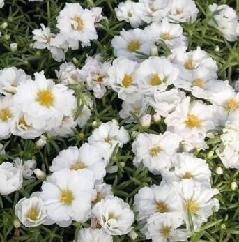 Портулак крупноцветковый Солнечная страна белый. Многолетнее растение, используемое как однолетнее. Образует кустик высотой 10 см. Белые, похожие на розочки, экстра махровые цветы, диаметром 3-4 см. Цветет с июня до заморозков.