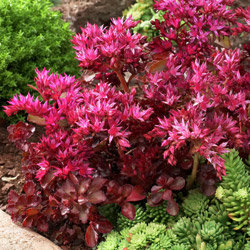 Седум ложный Вуду (Sedum spurium Voodoo). Изысканный редкий сорт образует низкий, подушкообразный ковер из бордово-красных сочных листиков, собранных в розетки.