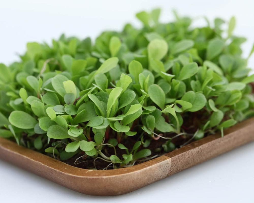 Цикорий листовой красный Россо. Мирозелень – молодые растения в фазе первой пары настоящих листьев. Срезаются через 10 дней после всходов. Содержат максимальное количество витаминов, микроэлементов, минеральных солей, каратиноидов и белков. Значительно полезней чем взрослые растения. Улучшат и разнообразят рацион.