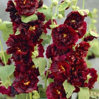 Шток-роза Темно-бордовая. Стебель мощный, ветвистый, высотой до 250 см. Цветки крупные, полумахровые и махровые, темно-бордовые. Соцветия компактные. Цветет в июле-сентябре. Используются для небольших групп на газоне, миксбордеров, декорирования стен, заборов и на срезку. Срезанные стебли в стадии бутонов распускаются в воде.