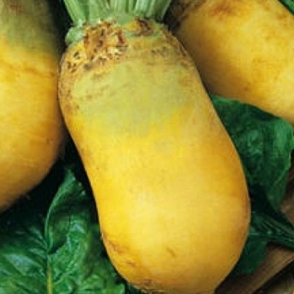 • Корнеплод цилиндрический, крупный, желтый с зеленой головкой, поверхность гладкая. Погружен в почву на 1/2-1/3, благодаря чему легко выдергиваются.