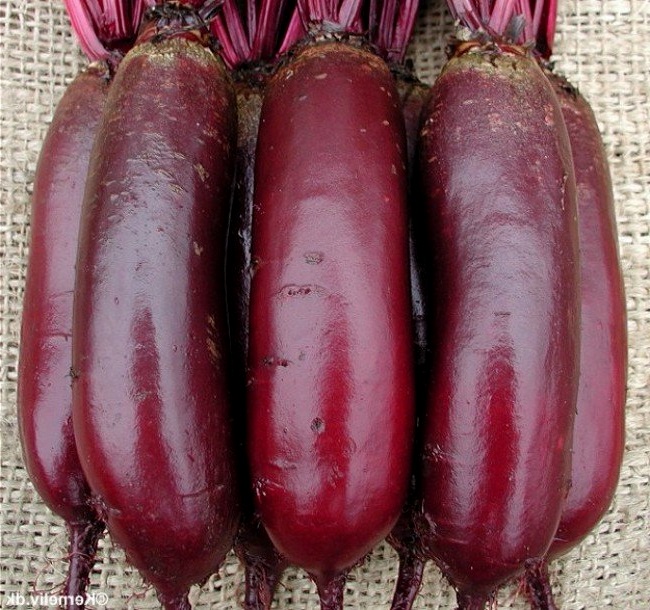 Свекла столовая Цилиндра. Корнеплоды цилиндрические, диаметр 5-9 см, длина 10-16 см. Мякоть сочная, сладкая, темно-красного цвета. Кожура тонкая, легко чистится. Корнеплоды погружены в землю на 1/3-1/4 длины и легко выдергиваются.