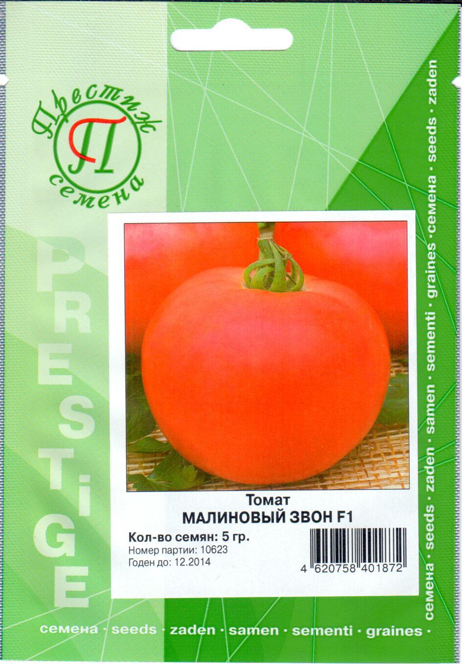 Томат Малиновый звон F1. Ранний гибрид томата. Созревание плодов наступает через 100-105 дней после появления всходов. Растение детерминантное, высотой 100-130 см, компактное, среднеоблиственное. Плоды выровненные, округлые, мясистые, ярко-малиновые, без зелёного пятна у плодоножки, семенные камеры небольшие. Средняя масса плода 160-200 грамм. Высокие вкусовые качества сочетаются с отличной транспортабельностью. Гибрид устойчив к растрескиванию, альтернариозу, фитофторозу и вирусу табачной мозаики. Предназначен для раннего выращивания в открытом грунте и плёночных теплицах. Рекомендуется для потребления в свежем виде.