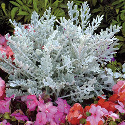 • Цинерария ценится именно за изумительную, серебряную окраску листьев, как фоновая культура в композициях с цветками ярких окрасок.