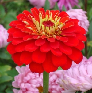 Цинния изящная Кровавая Мэри. Растение мощное, ветвистое от основания, высотой до 80 см. Плотные полушаровидные соцветия, диаметром 8-10 см, ярко-красные. Цветет с июля по сентябрь. Используют для оформления цветников, рабаток и срезки.