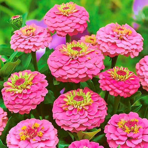 Цинния лиллипут Розовая. Распространенное засухоустойчивое неприхотливое растение, образующее разветвленные кустики 45-50 см высотой. Соцветия многочисленные, небольшого диаметра, махровые. Цветет обильно, с июля до октября. Используют в клумбах, рабатках, группах и для срезки.
