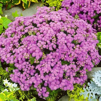 Агератум Розовый шар. Аккуратные пушистые соцветия. Компактный кустик высотой до 30 см. Листья крупные, опушенные. Соцветия плотные, крупные 1,5-1,7 см в диаметре, рыльца столбиков длинные, розовые. Цветет с середины июня до октября. Хорошо переносит стрижку. Используют для оформления цветников различного назначения.