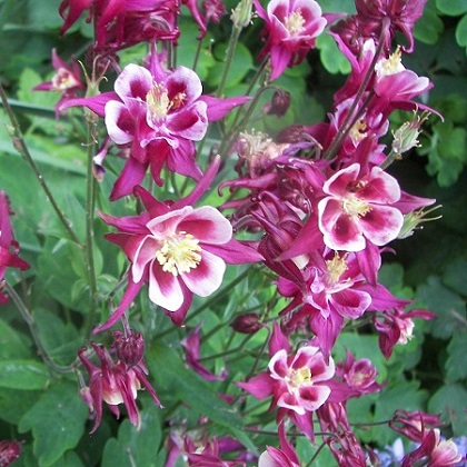 Аквилегия гибридная Малиновая звезда - многолетнее изящное растение с ажурными сизоватыми листьями. Куст красивой формы, высотой 70 см. Цветы крупные. Цветет с мая по июль. Используют для посадок группами на клумбах, в травянистых бордюрах и на срезку. Срезку производят, когда распускаются первые 3-5 цветков.