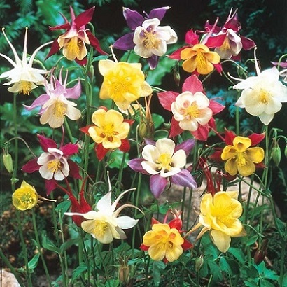 Аквилегия обыкновенная Смесь окрасок очень декоративная разновидность с цветками разнообразной окраски. Растение высотой до 80см, с раскидистой формой куста, 40-50 см в поперечнике. Листья дважды тройчато-рассеченные, сизоватые. Цветки 3-4 см в диаметре. Цветет в июне — июле. Используют для посадок группами на клумбах, в травянистых бордюрах, на срезку.