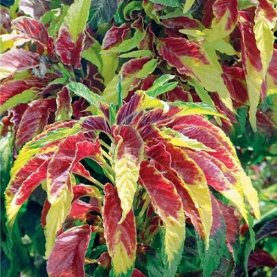 Амарант трехцветный Иллюминация. Симпатичный разноцветный кустик высотой около 50 см. Листья удлиненно-яйцевидной формы трехцветные зелено-бордовые, красно-желтые, оранжево-желтые. Рекомендуется для одиночных и групповых посадок на газоне, заднего плана рабаток и миксбордеров.